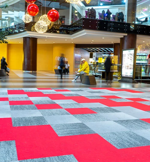 Suministro e instalación en el Lobby del Centro de Negocios Design Center, 50m2 de alfombra modular Tuntex como parte de la decoración por época navideña.